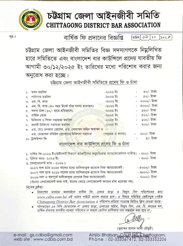 বার্ষিক ফি প্রদানের বিজ্ঞপ্তি